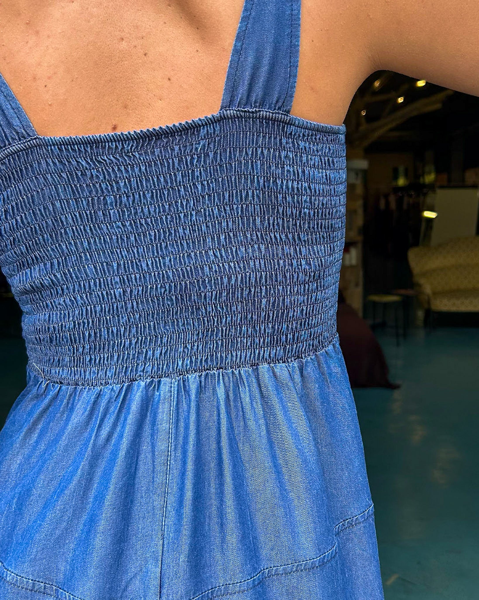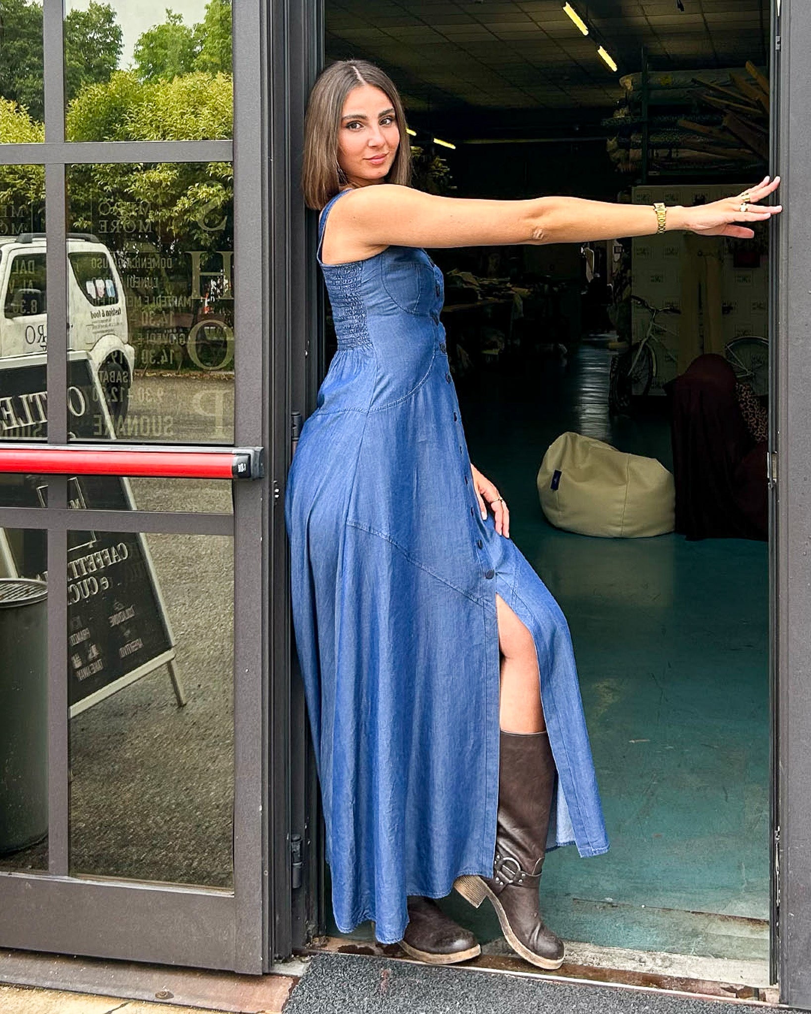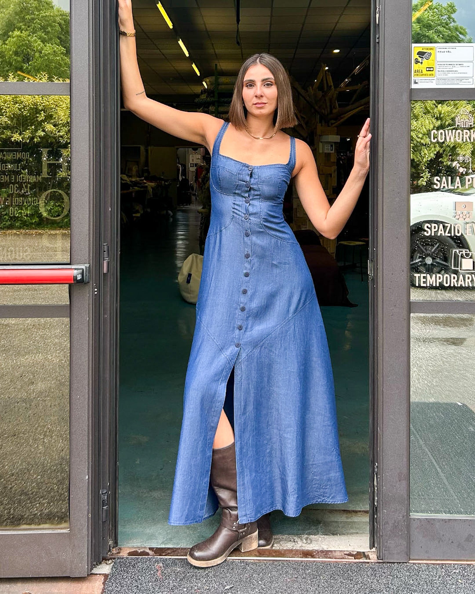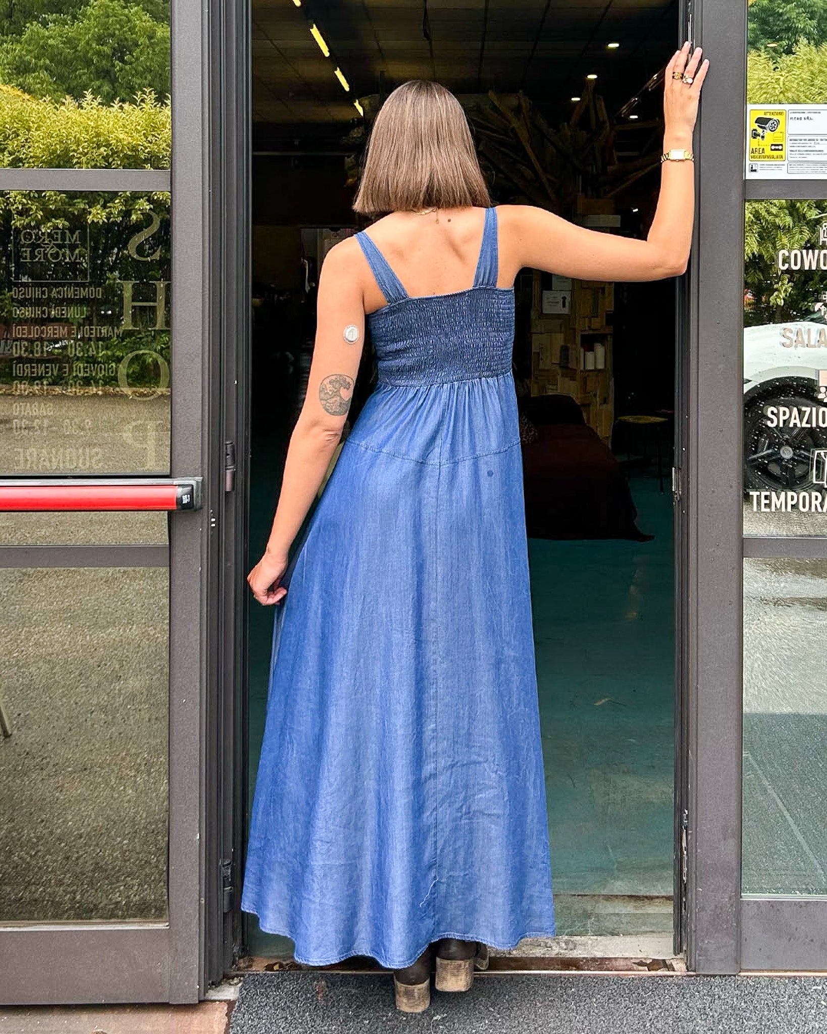 Abito lungo jeans elasticizzato sul retro, effetto Boustier- 100% Made in Italy