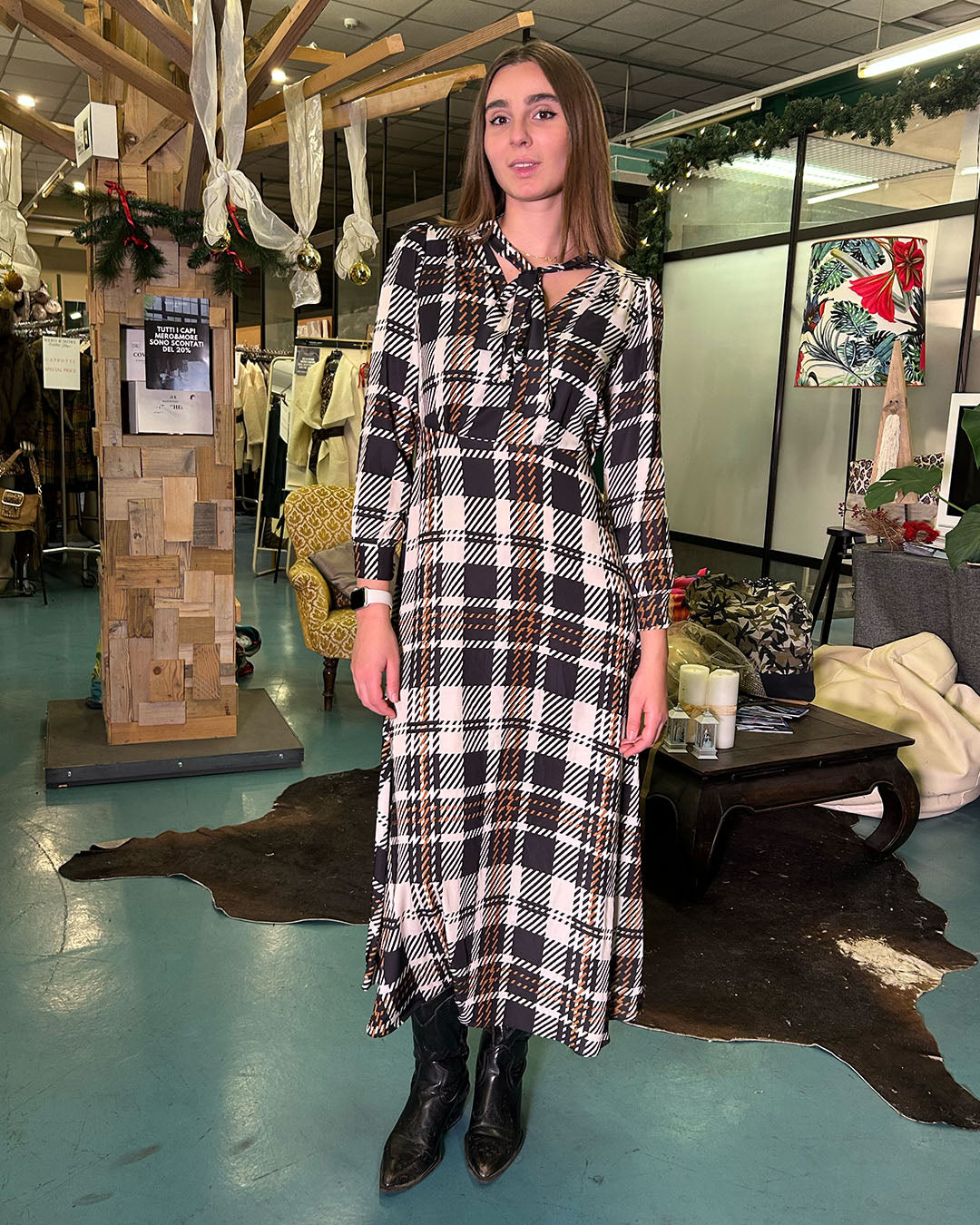 Abito midi con fantasia scozzese e fiocco sullo scollo - 100% Made in Italy